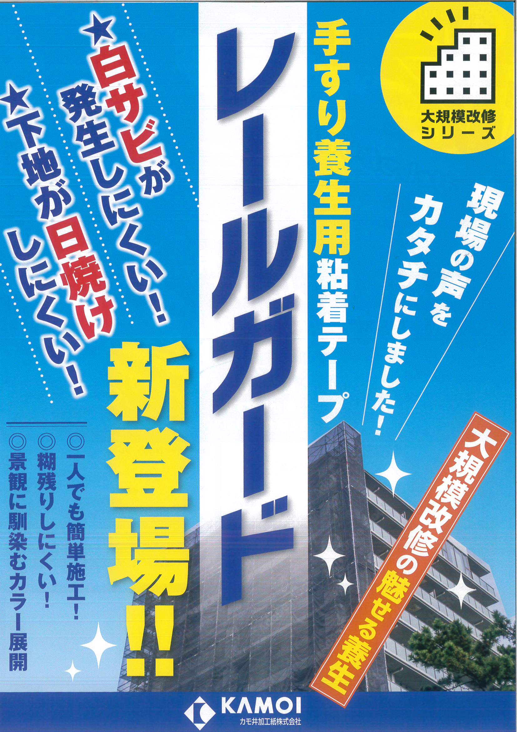 手すり養生用粘着テープ【レールガード】新発売 2025.10.30 手すり養生用粘着テープ【レールガード】2025年10月14日発売・出荷開始! ※従来品【トップガード】につきましては、在庫がなくなり次第廃番となりますので ご注文の際は、弊社営業担当までお問い合せ下さいませ。 🔗手すり養生用粘着テープ【レールガード】詳細はこちらをクリック